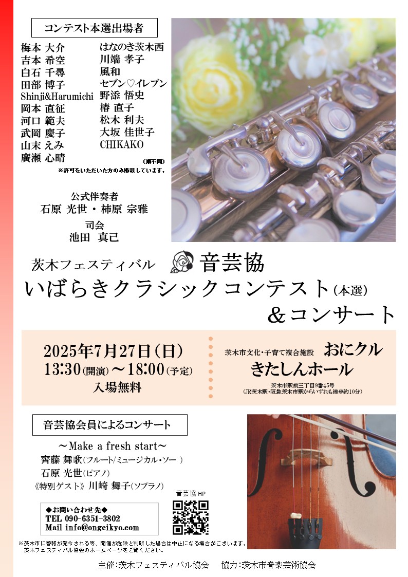 7月27日(日)13:30~ おにクル1階きたしんホールにて、《茨木フェスティバル 音芸協 いばらきクラシックコンテスト&コンサート2025》を開催します。